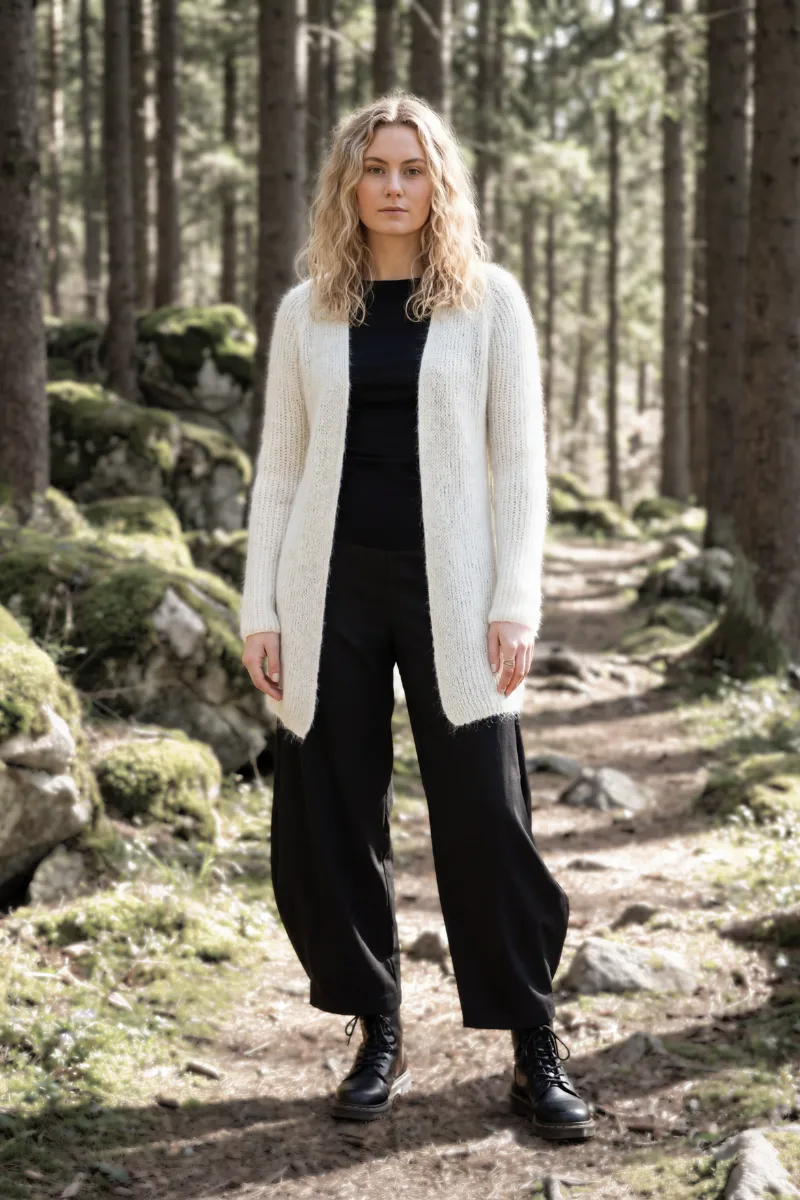 Il cardigan corto donna in lana mohair Nuvoletta è una coccola avvolgente, calda ma leggera, perfetto per le mezze stagioni e l’inverno. Aperto sul davanti e senza bottoni, ha una vestibilità unica comoda, che si adatta a diverse fisicità — dalla taglia 40 alla 48. Il cardigan è pensato per essere indossato anche da bambine dai 5 ai 12 anni.