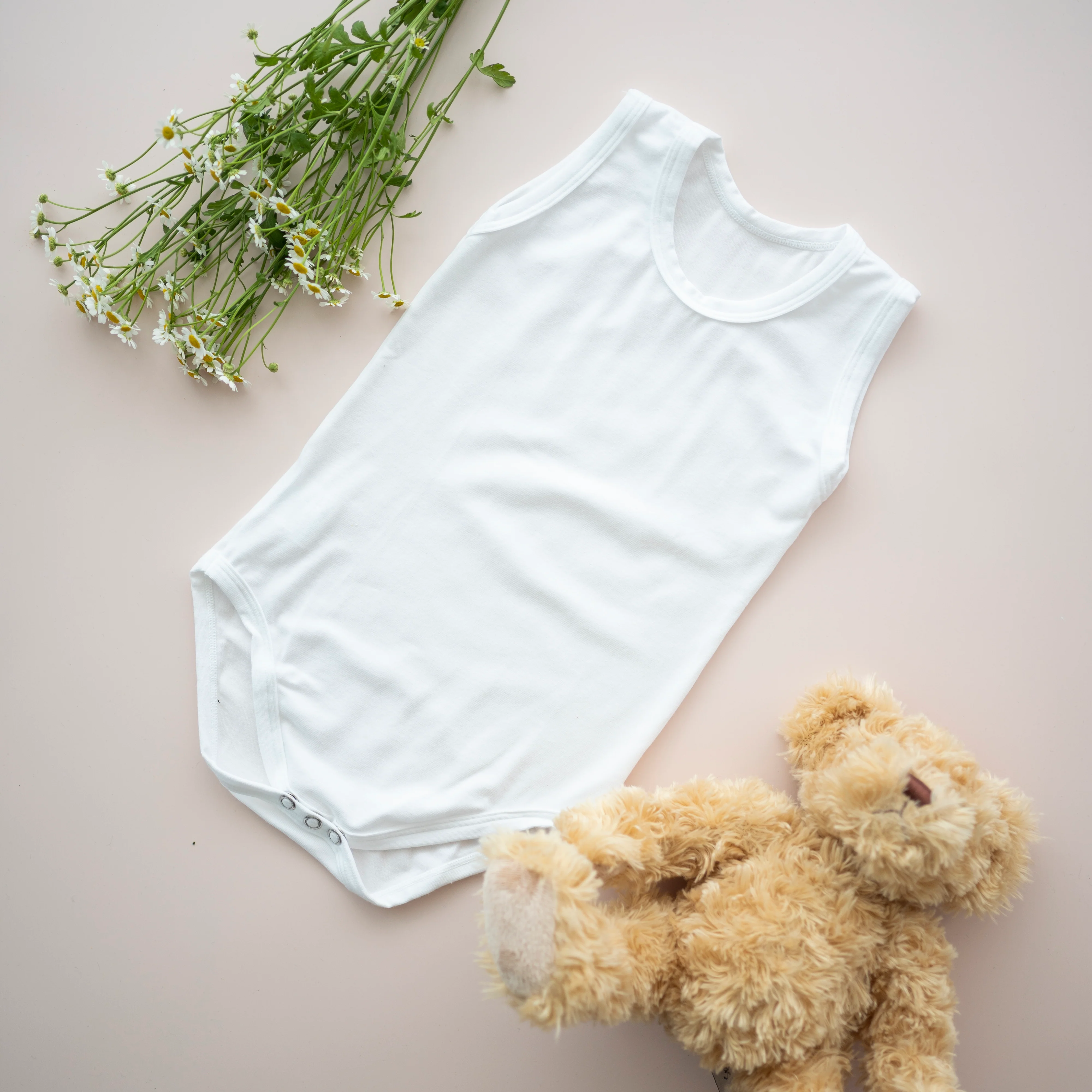 Body senza maniche per neonato e neonata, con scollo rotondo, e apertura con bottoncini a pressione sulla spalla e sul cavallo per facilitare il cambio pannolino.